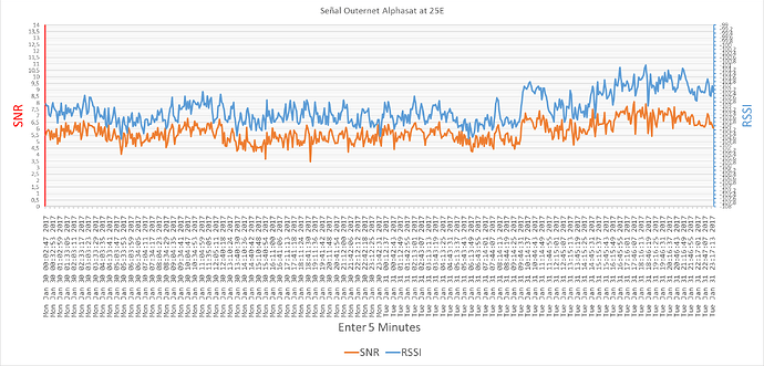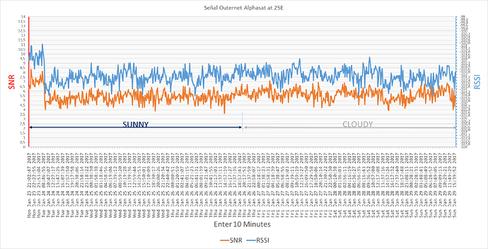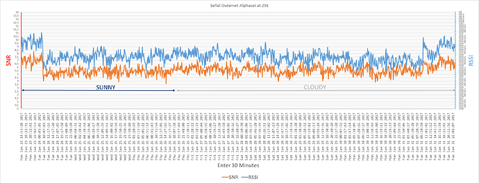 Grafica de la señal en Alphasat 25E, desde el día del fallo de la señal hasta hoy, el intervalo de captura de los datos es de 10 minutos, también indico el cambio de soleado a nublado (con algo de lluvia), la instalación no se ha tocado ni cambiado nada, el único cambio es el del clima.