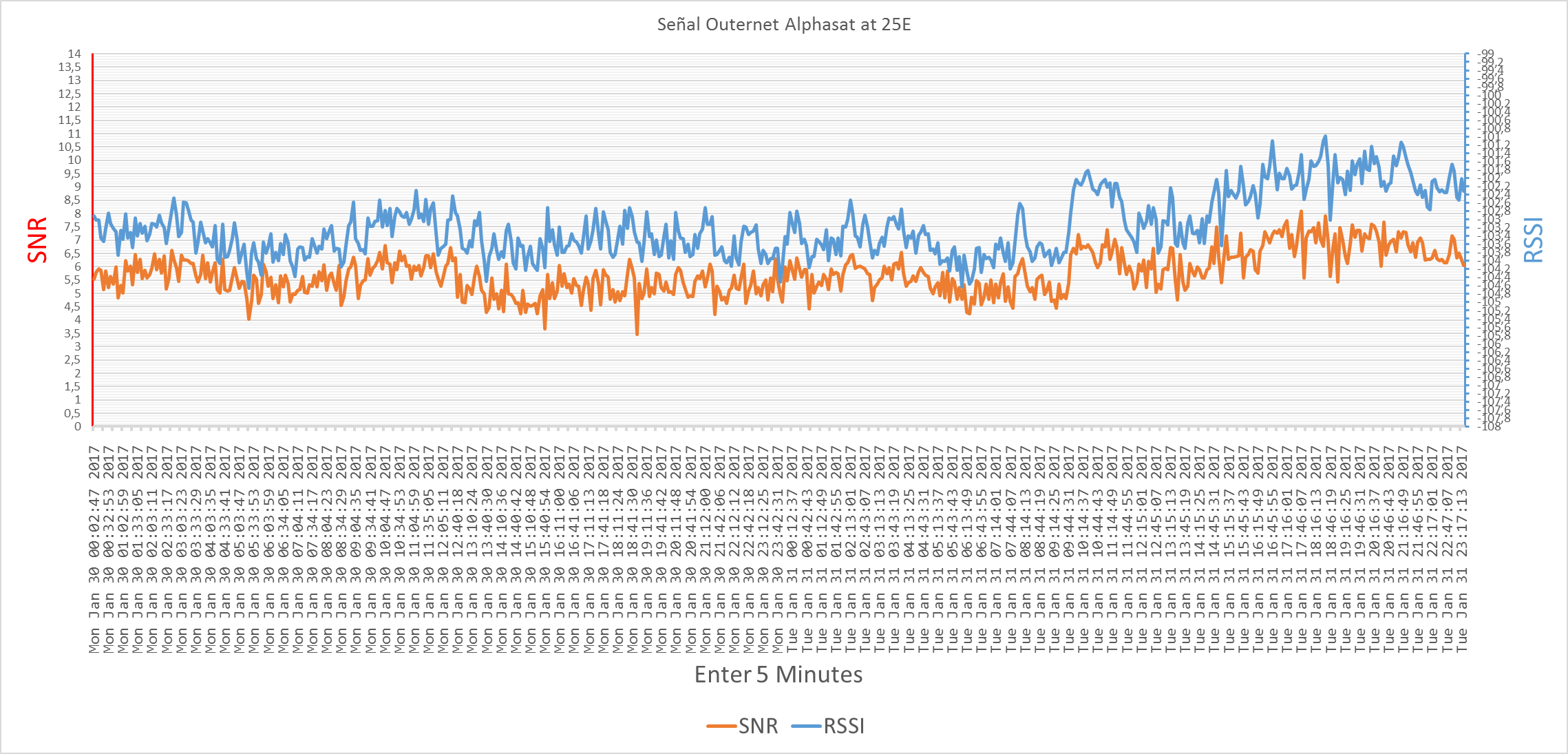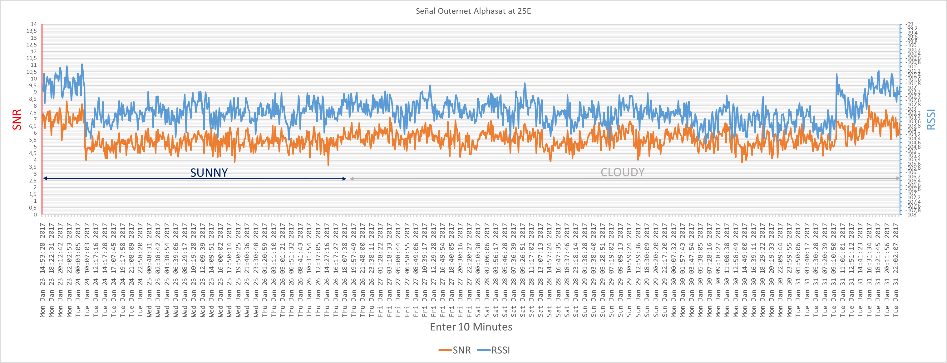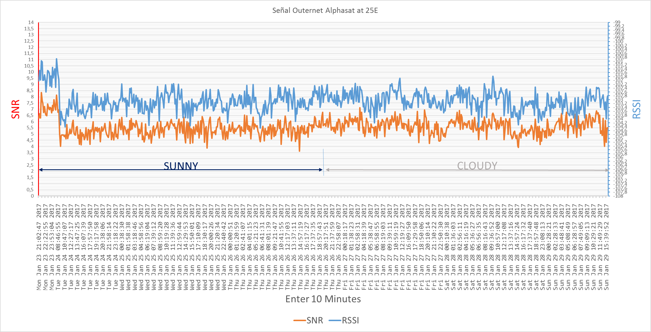 Graph of the signal in Alphasat 25E, from the day of the signal failure to today, the data capture interval is 10 minutes, also indicated the change from sunny to cloudy (with some rain), the installation is not Has touched or changed anything, the only change is the weather.
