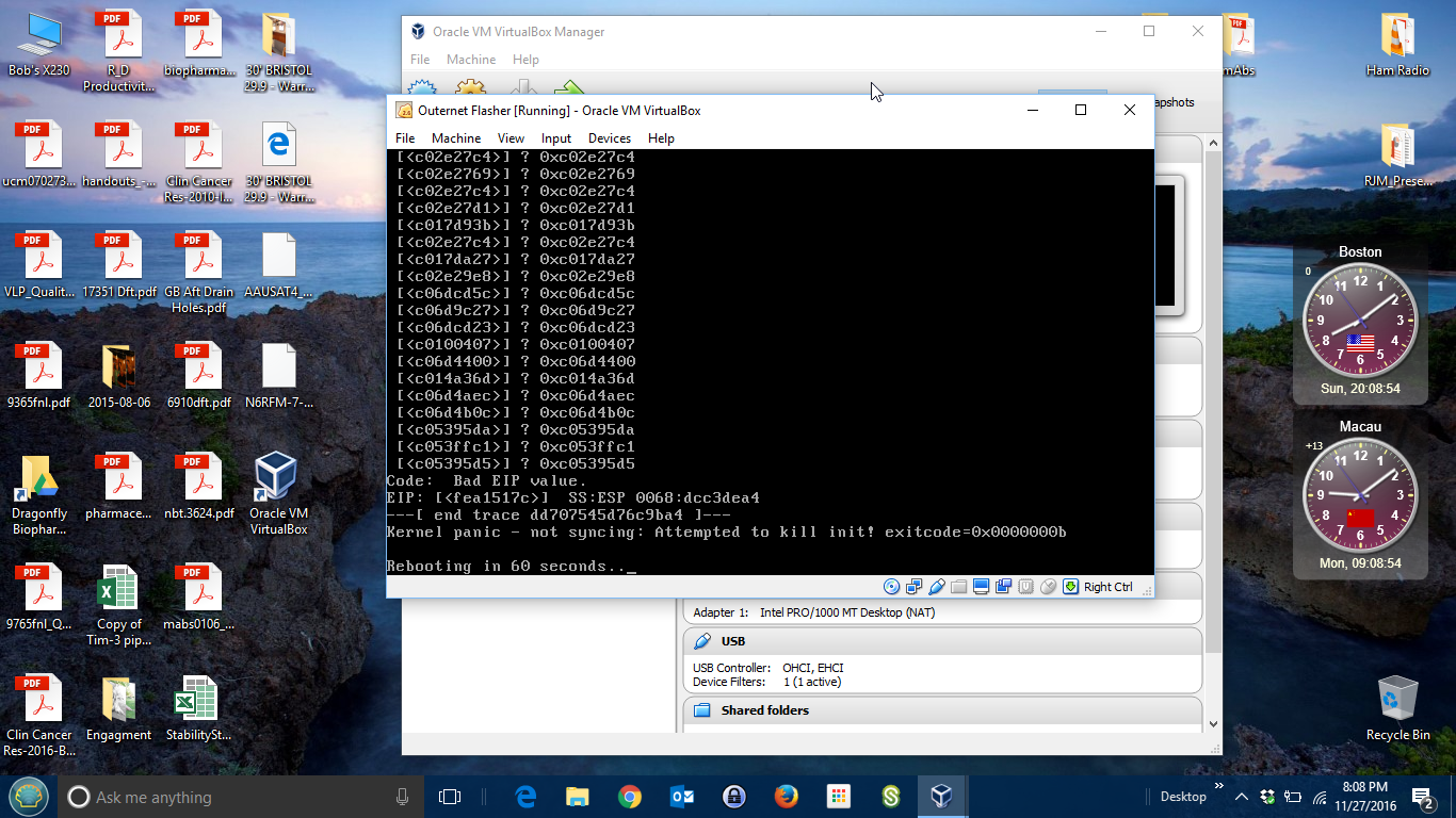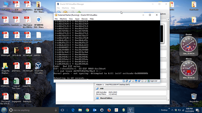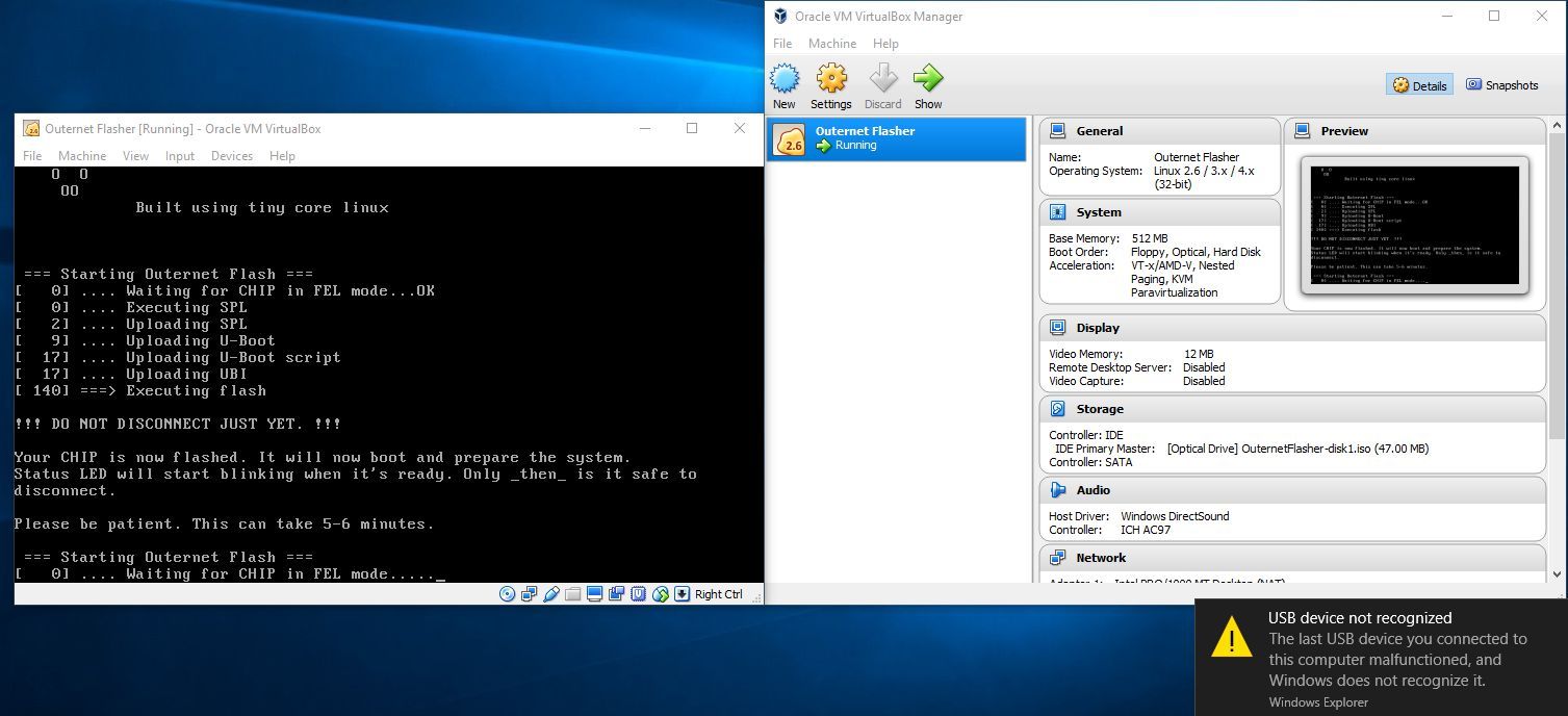 It worked under Windows 10. Just enabled VT-x in BIOS. BTW, did not have to remove libusbK driver. Starting VM seems to disconnect the CHIP from the driver. What I did observe is that second “Starting Outernet Flash” showed up. I waited 5 minutes but had to power cycle.
