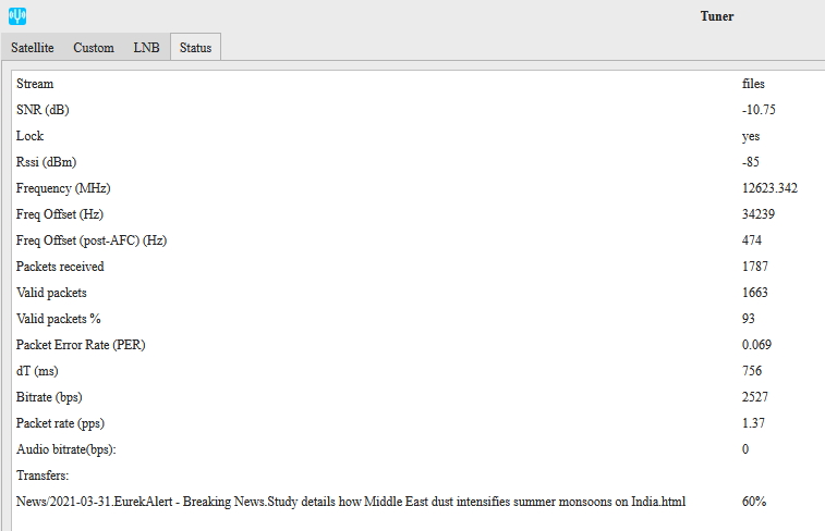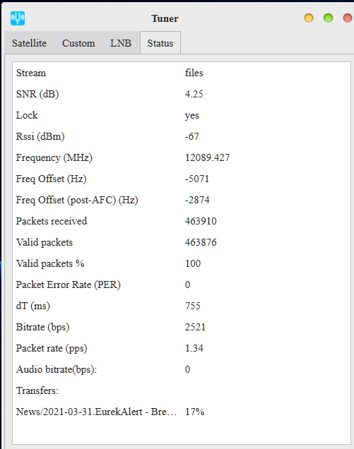 Hi, Manuel. I have a couple of questions pertinent to the Othernet Status page: can it be made to refresh automatically like the old one did?, and, it appears to not be reporting accurately. I have not seen a PER above zero while watching my Skylark program, but it shows a PER of 34. I have not seen that before, and the percentage is 100%…