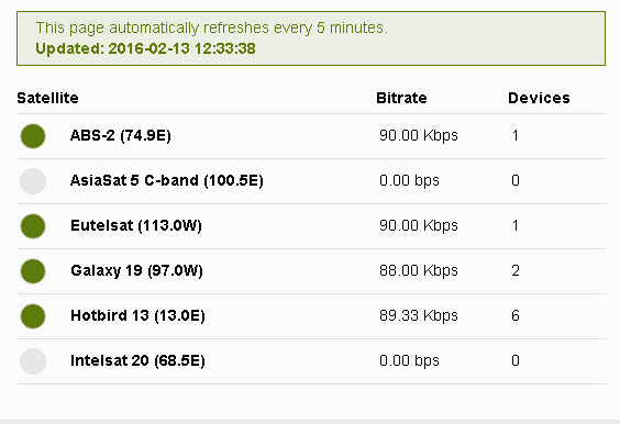 The light being on is related to the number of receivers that are correctly pointed/receiving and connected to the internet. This is basically a community-generated status page. The teleports we use let us know if the signal is going up the satellites and then we ask our users to help us determine whether everything is being received properly. The only reason the green light is not showing for AS5 is because there are no receivers that are passing monitoring packets back to the status page.